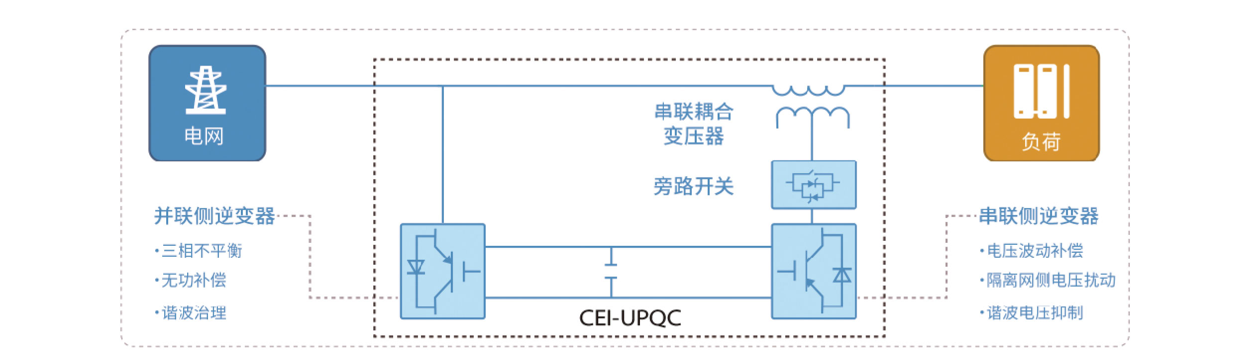 串聯側逆變器(qì)通(tōng)過調節隔離(lí)變壓器(qì)的(de)副邊電(diàn)壓來(lái)實現(xiàn)負載側電(diàn)壓的(de)調節與閉環控制&(zhì),主要(yào)用(yòng)于保證負載側電(diàn)壓穩定在設定值上(shàng),除了(le)解決電(diàn)壓波動較大(dà)之外(wài),同時(shí)串 聯側還(hái)可(kě)用(yòng)幹消除負載供電(diàn)側的(de)電(diàn)壓質量問(wèn)題:電(diàn)壓諧波超标、電(diàn)壓三相 (xiàng)不(bù)平衡、功率因數(shù)低(dī)下(xià)等。